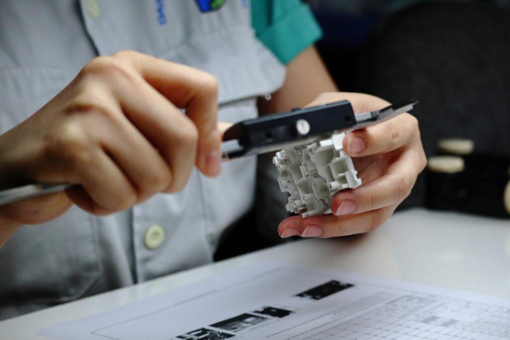 本社の設計部で成形性、量産性、金型での問題の発生しにくさ、メンテナンスのし易さなどを盛り込んだ形で金型の基本設計を検討し、図面を作成。その後ホーチミン工場で、金型設計・CAMプログラム作成・機械加工・仕上げまで、一貫した金型製作を行います。これらは全てベトナム人技術者によって行います。